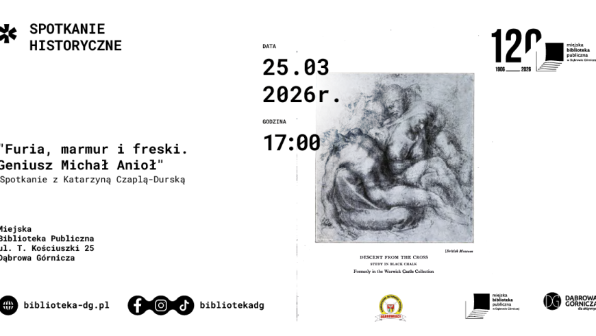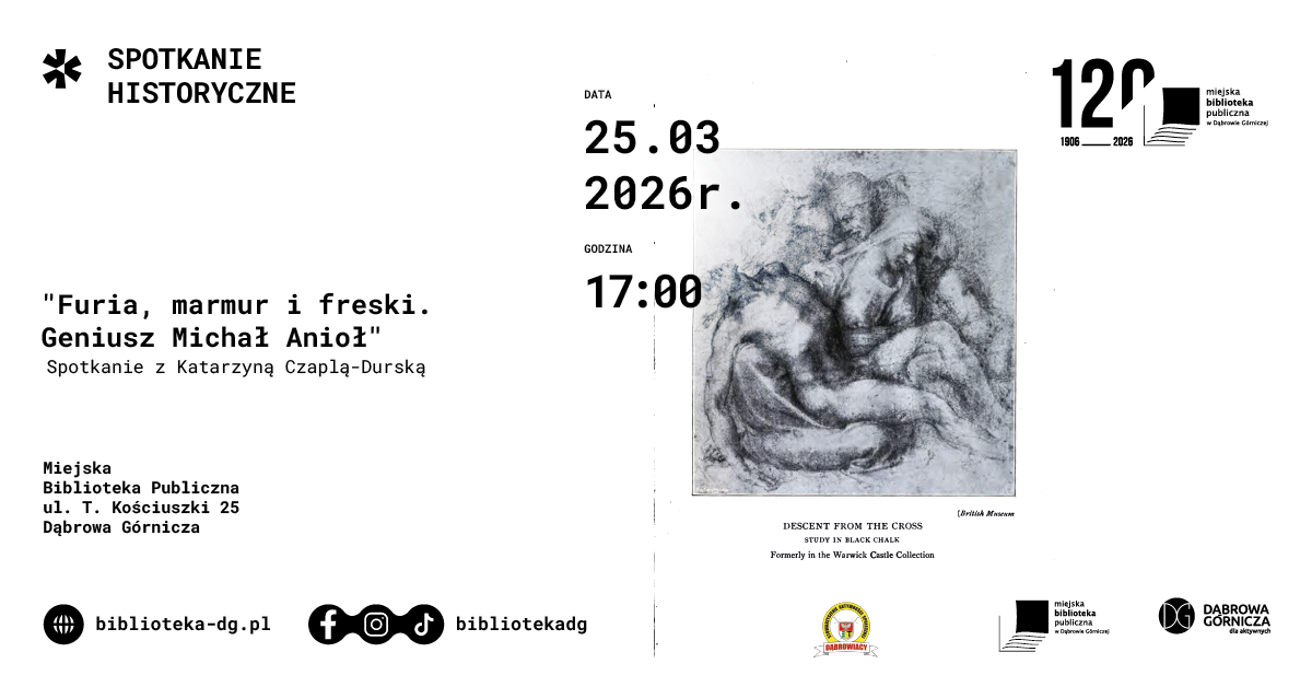Miejska Biblioteka Publiczna wraz ze Stowarzyszeniem Aktywności Społecznej – Dąbrowiacy serdecznie zapraszają na wydarzenie pn. „Furia, marmur i freski. Geniusz Michał Anioł”. Spotkanie poprowadzi Katarzyna Czapla-Durska.